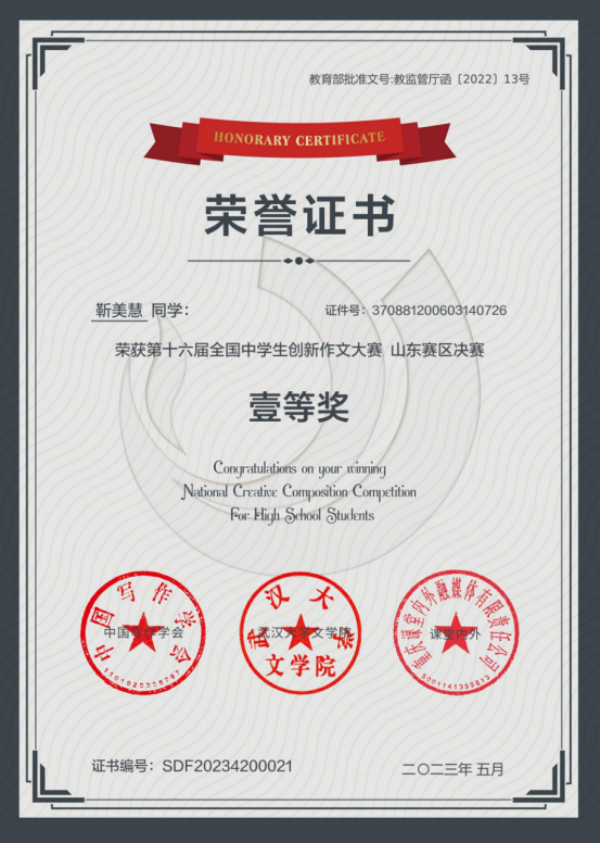 5月25日,我校在第十六届全国中学生创新作文大赛山东赛区决赛喜获佳绩,共计11名学子获得省级决赛奖项。高二·1班牛瑞霖同学获得山东赛区决赛特等奖,高二·10班王晨歌、靳美慧及高二·1班张逊宇获一等奖,高二·13班孔令浩、高二·7班刘嘉琪、高二·6班郭蓓蓓获二等奖,高二·13班赵一畅、高二·3班邱雨晨、葛雅欣及高二·2班孔睿姝获三等奖。其中,牛瑞霖、王晨歌、靳美慧、张逊宇共4名同学晋级全国总决赛。