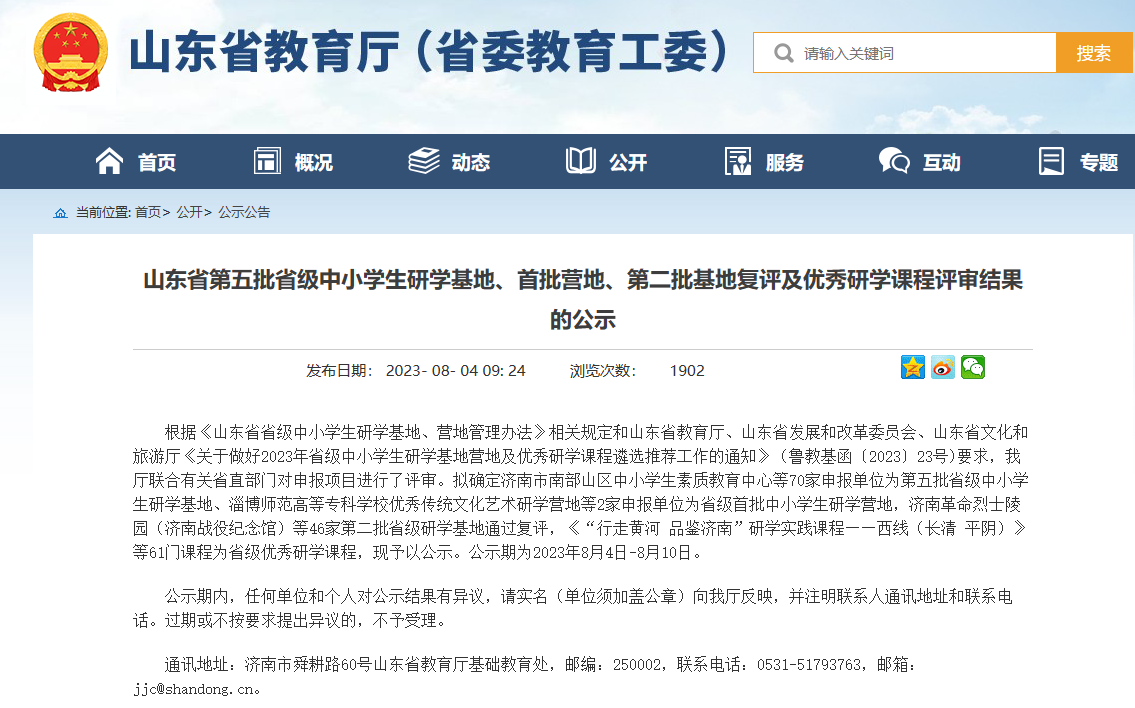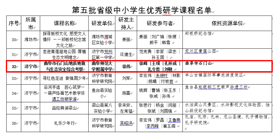 近日,省教育厅公示了山东省第五批省级中小学生研学基地、首批营地、第二批基地复评及优秀研学课程评审结果。我校申报的《曲阜市石门山地质地貌与生态安全综合考察》获评第五批省级中小学生优秀研学课程。该评选由省教育厅、省发展和改革委员会、省文化和旅游厅共同组织,全省共有61门课程入选省级中小学生优秀研学课程。