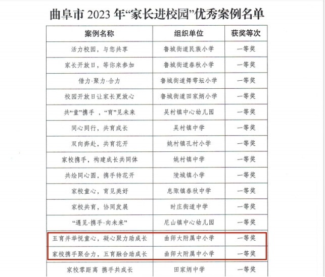 近日,曲阜市教育和体育局公布曲阜市2023年“家长进校园”优秀案例名单,我校报送的《五育并举悦童心,凝心聚力助成长》《家校携手聚合力,五育融合助成长》均获一等奖。